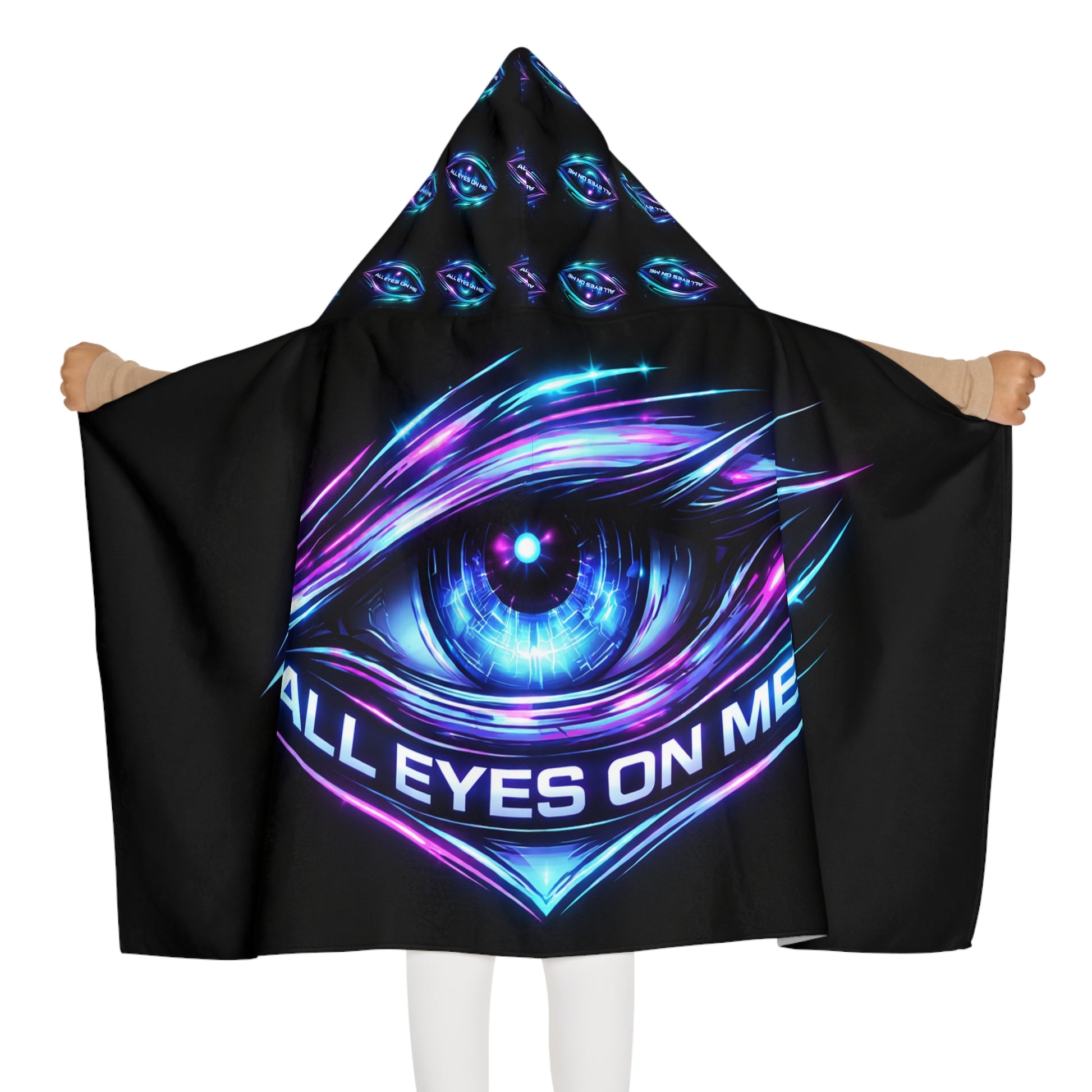 The design—an intense, glowing eye with the phrase “ALL EYES ON ME”—brings playful confidence and a bit of adventure to everyday moments. The hood carries the repeating motif, so the look reads from every angle. Lightweight to carry, absorbent to dry, and visually striking, this towel becomes part of their routine: emerging from the water, shrugging on the hood, and heading straight into the next story or game.
