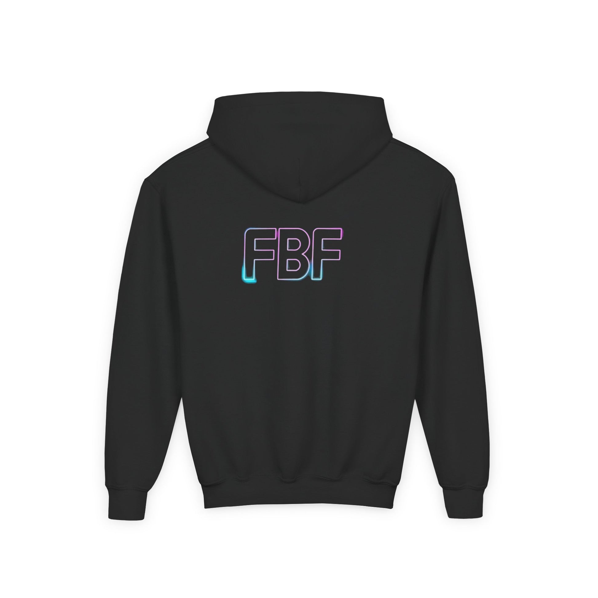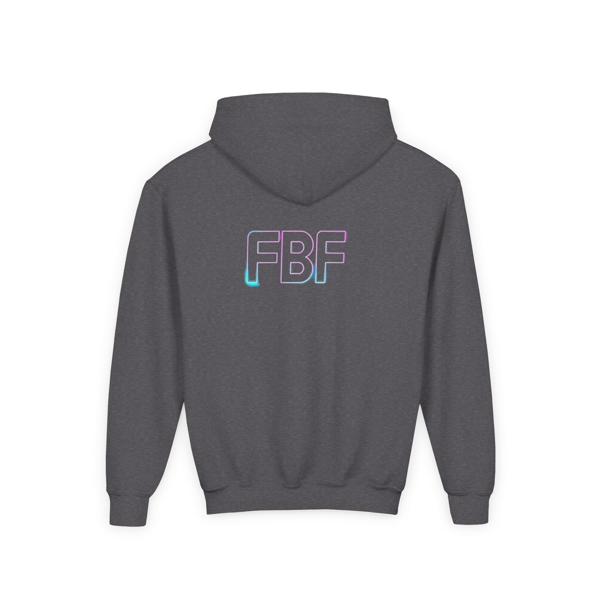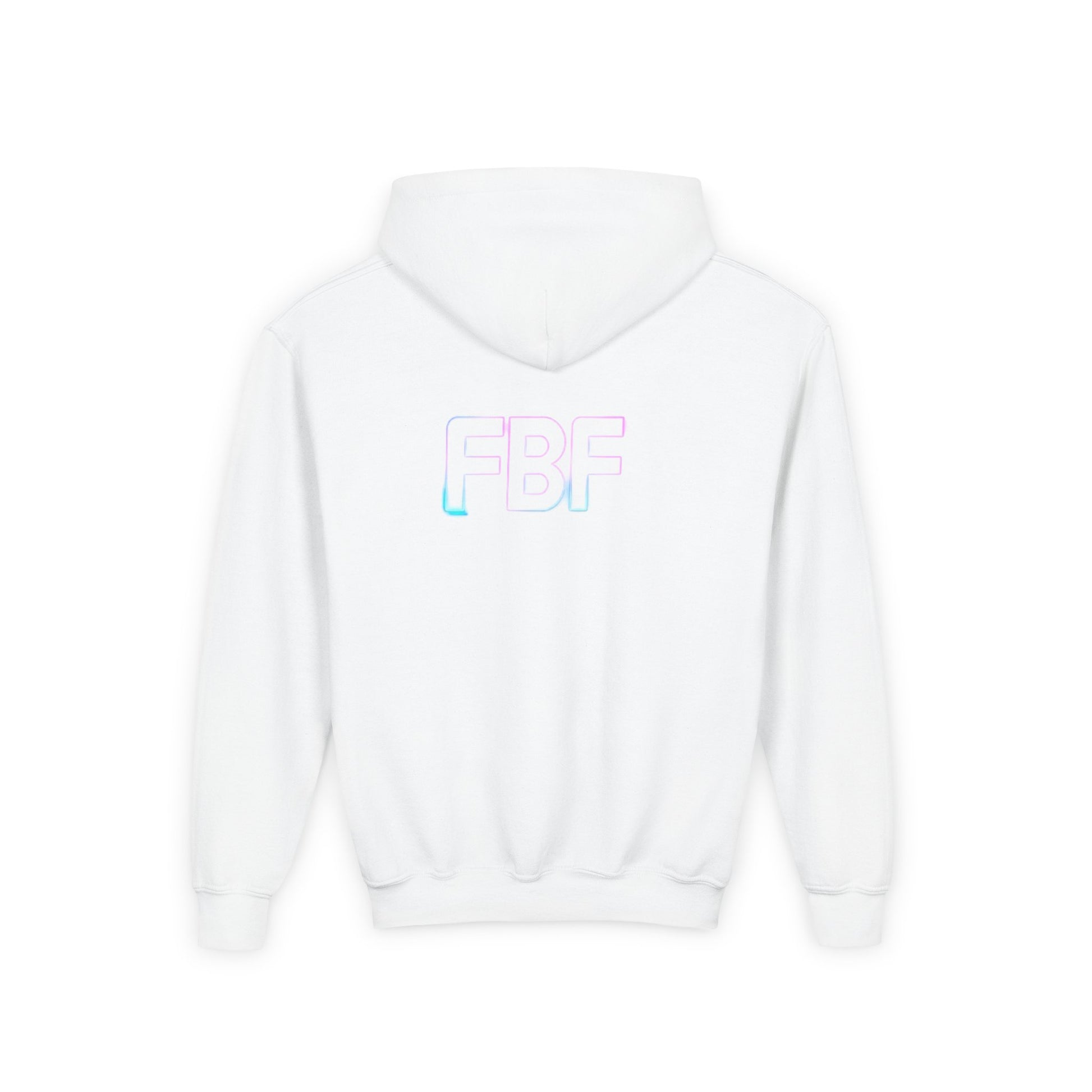 Soft, cozy, and quietly expressive — this youth hoodie wraps kids in a familiar, lived-in feel while showcasing a subtle pop of color. The front holds a small, pastel audio-wave motif that feels like a secret shared between friends. On the back, soft gradient letters read FBF in airy tones that shimmer between pink, lavender, and blue. Lightweight but warm, it layers well over tees and under jackets for school days, weekend hangouts, or long car rides. The roomy kangaroo pocket keeps hands warm and small treasures close. Built to stand up to play and washes, it keeps its shape and color so the design stays bright through seasons of wear.